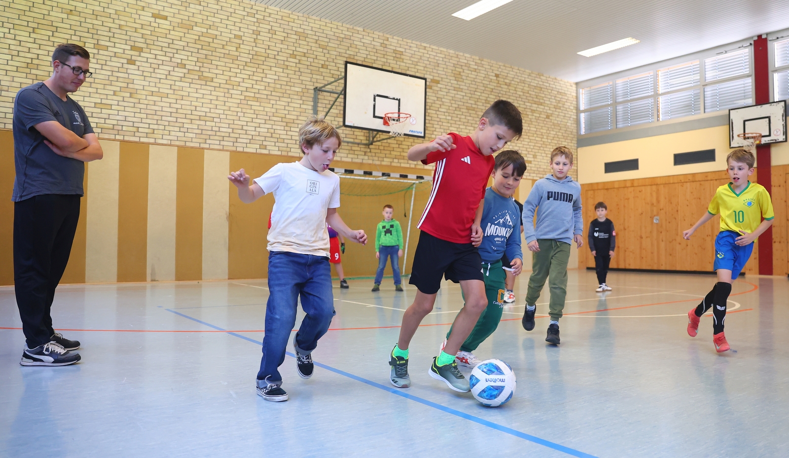 Seit Projektbeginn im Jahr 2012 wurden durch „Fußball macht Schule“ mehr als Schülerinnen und Schüler erreicht – hier die Fußball-AG der Grundschule „Waldschule“ in Horressen mit Leiter Melvin Singer.