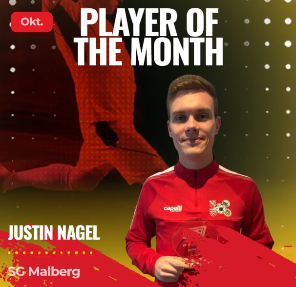 Justin Nagel: Hallo zusammen, vielen Dank für die Auszeichnung. Ich bin Justin Nagel, 26 Jahre alt und arbeite als Einkaufsleiter in einem Stanz- und Drahtbiegeunternehmen. Fußball nimmt einen sehr großen Teil der Freizeit ein. Ansonsten spiele ich gerne Darts mit Freunden, wenn die Zeit es zulässt.