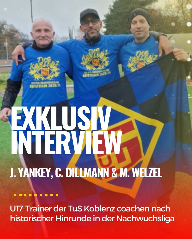 Jeffrey Ekow Yankey, Christof Dillmann und Mike Welzel – diese Namen werden wohl für immer mit einem historischen Erfolg des Traditionsvereins TuS Koblenz in Verbindung gebracht werden. Diese drei Männer bilden das Trainerduo der U17-Mannschaft der Schängelschmiede und sind seit Sommer 2025 mit dem 2009er-Jahrgang in der Junioren-Regionalliga Südwest auf Punktejagd gegangen. Abgeschlossen wurde die wohl historische 13 Spiele dauernde Hinserie mit 31 eingefahrenen Zählern und einem Torverhältnis von 48:15 auf dem zweiten Rang hinter der U16 des Fußball-Bundesligisten FSV Mainz 05. Da bereits die U17 aus der Landeshauptstadt in der Nachwuchsliga spielt, rücken die Schängel von Rhein und Mosel in die Nachwuchsliga auf. Ab dem 8. Februar werden sich die Schützlinge von Jeffrey Ekow Yankey, Christof Dillmann und Mike Welzel in der Hauptrunde Liga B Gruppe D mit den U17-Manschaften des 1. FC Heidenheim, dem 1. FC Saarbrücken, den Kickers Offenbach, dem SC Freiburg, dem SSV Ulm 1846 Fußball und der TSG Wieseck in Hin- und Rückspielen messen. Die besten vier Mannschaften haben nach den Begegnungen die Möglichkeit, in der Saison 2026/2027 auf Anhieb in der höchsten deutschen Spielklasse im Nachwuchsfußball auf Torejagd zu gehen. Im exklusiven Interview berichtet das Erfolgstrio von der im Sommer 2025 begonnenen Zusammenarbeit, der historischen Hinrunde und den Zielen für die erstmalige Teilnahme in der NLZ-Liga. Für die Fußballkenner Yankey (seit 2022 bei der TuS Koblenz), Dillmann (seit 2025 bei den Schängeln) und Welzel (seit 2015 bei der TuS Koblenz) ist klar, dass die Rückserie in der NLZ-Liga ein Geschenk ist, jedoch nur ein Kräftemessen mit den besten Teams aus dem Süden Deutschlands für die optimale Entwicklung der eigenen Mannschaft sorgen wird. Es bleibt spannend abzuwarten, welche Rolle die U17 aus der Schängelschmiede in der am 8. Februar beginnenden Rückserie spielen wird. Viel Spaß beim Lesen.